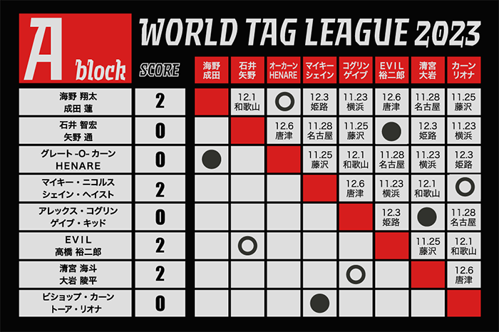 第4試合は11.23横浜のAブロック公式戦で激突するマイキー・ニコルス&シェイン・ヘイスト組(1勝0敗)とEVIL&高橋裕二郎組(1勝0敗)が、それぞれ藤田晃生、ディック東郷とトリオを結成し前哨戦。H.O.Tの無法攻撃に、TMDKはひるまず応戦。だが、最後は孤立した藤田を、EVILがEVILで葬った。試合後、ニコルス&ヘイストは怒りを見せるが、H.O.Tは不敵な笑みで挑発した。