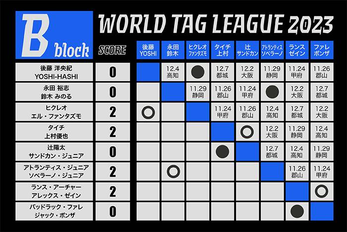11月21日(火)、東京・後楽園ホールでタッグの祭典『レック Presents WORLD TAG LEAGUE 2023』第2戦が開催された。今大会ではBブロックの公式戦1戦目(全9戦)の4試合を中心に、熱闘が繰り広げられた。