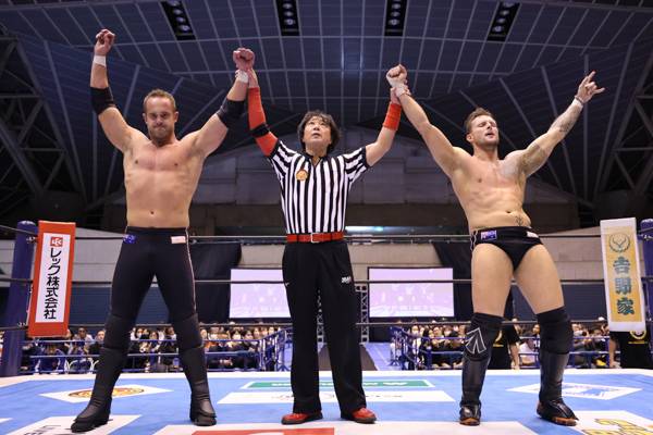 第5試合のAブロック公式戦では、海野翔太&成田蓮組(1勝1敗)と“Gates of Agony”ビショップ・カーン&トーア・リオナ組(0勝2敗)が対決。G・o・Aの力強い攻めに対し、海野&成田もひるまず応戦。終盤、G・o・Aは海野にheavens gatesを炸裂。しかし、海野が必死にカバーすると、成田が相手チームを分断。最後は海野がカーンをデスライダーで突き刺し、接戦を制した。