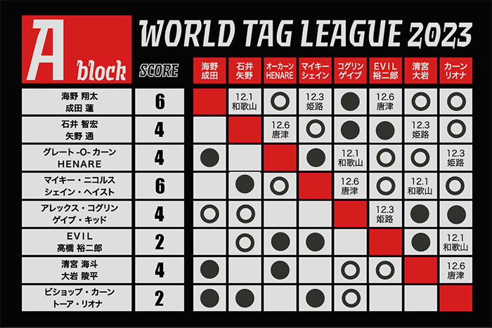 11月28日(火)、愛知・名古屋国際会議場・イベントホールでタッグの祭典『レック Presents WORLD TAG LEAGUE 2023』第7戦が開催された。今大会ではAブロックの公式戦4戦目(全7戦)の4試合を中心に、熱闘が繰り広げられた。