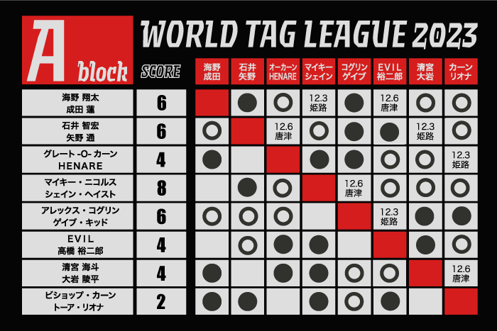 12月1日(金)、和歌山・和歌山県立体育館でタッグの祭典『レック Presents WORLD TAG LEAGUE 2023』第9戦が開催された。今大会ではAブロックの公式戦5戦目(全7戦)の4試合を中心に、熱闘が繰り広げられた。